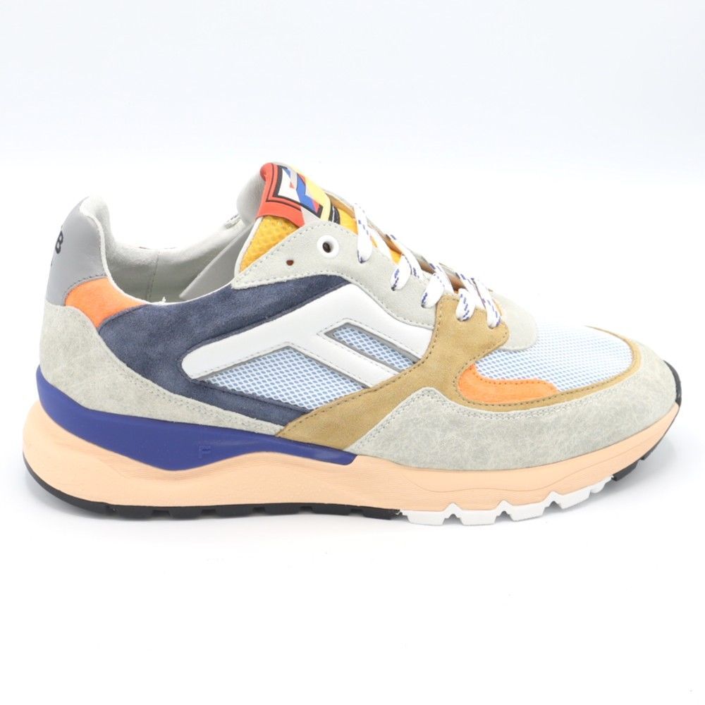 De Treener sneaker van Floris van Bommel is uitgevoerd met een soepele, lichtgewicht zool met een slijtvast rubber loopvlak. Aan de zijkant van de schoen is ter herkenning een gekantelde F verwerkt. De kleurrijke sneaker is uitgevoerd in een rijke mix van textiel en suède. De binnenkant van de sneaker is afgewerkt met een hoogwaardige lederen voering. Het uiterst comfortabele voetbed, dat ook met leer bekleed is, is uitneembaar en kan eventueel worden vervangen door een eigen voetbed of steunzool. Merk: Floris van BommelType Schoen: SneakerKleur: Oranje Blauw GrijsMateriaal Buitenkant: Leer TextielMateriaal Binnenkant: LeerMateriaal Zool: RubberWijdtemaat: G1/2Uitneembaar voetbed: JaMaatvoering: Halve Maten