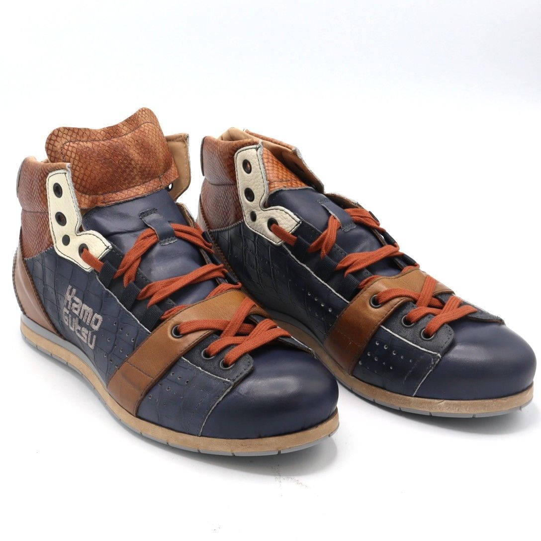 De schoenen van Kamo Gutsu kenmerken zich door unieke kleurencombinaties en gedurfde ontwerpen die een mix zijn van Belgisch vakmanschap en Japanse esthetiek. De kleurencombinaties zijn vaak geïnspireerd op de traditionele Japanse kunst en cultuur, waardoor de schoenen een artistieke en originele uitstraling hebben. Met een paar Kamo Gutsu schoenen maak je zeker een statement en voeg je een vleugje kunstzinnigheid toe aan je outfit.Merk: Kamo-GutsuType Schoen: Sneaker Half HoogKleur: Blauw CognacMateriaal Buitenkant: LeerMateriaal Binnenkant: Leer Materiaal Zool: RubberWijdtemaat: HUitneembaar voetbed: JaMaatvoering: Hele Maten