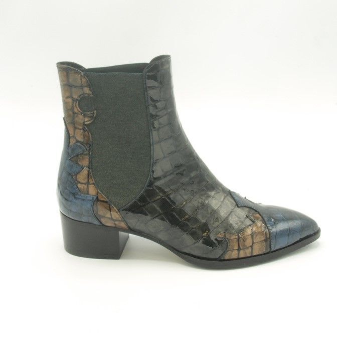 Pertini staat bekend om haar mooie materialen. Dit Chelsea laarsje is gemaakt van mooi lakleer in een krokodillenprint. De verschillende kleuren van Blauw Bruin en Groenbrons maakt het enkellaarsje tot een eye-catcher. met 4cm hoge blokhak en de elegante spitse leest heeft het een vrouwelijke uitstraling.Merk: PertiniType Schoen: Chelsea LaarsKleur: Blauw, Bruin Groen BronsMateriaal Buitenkant: LakleerMateriaal Binnenkant: leerMateriaal Zool: RubberWijdtemaat: Normaal Uitneembaar Voetbed: NeeHakhoogte: 4cm