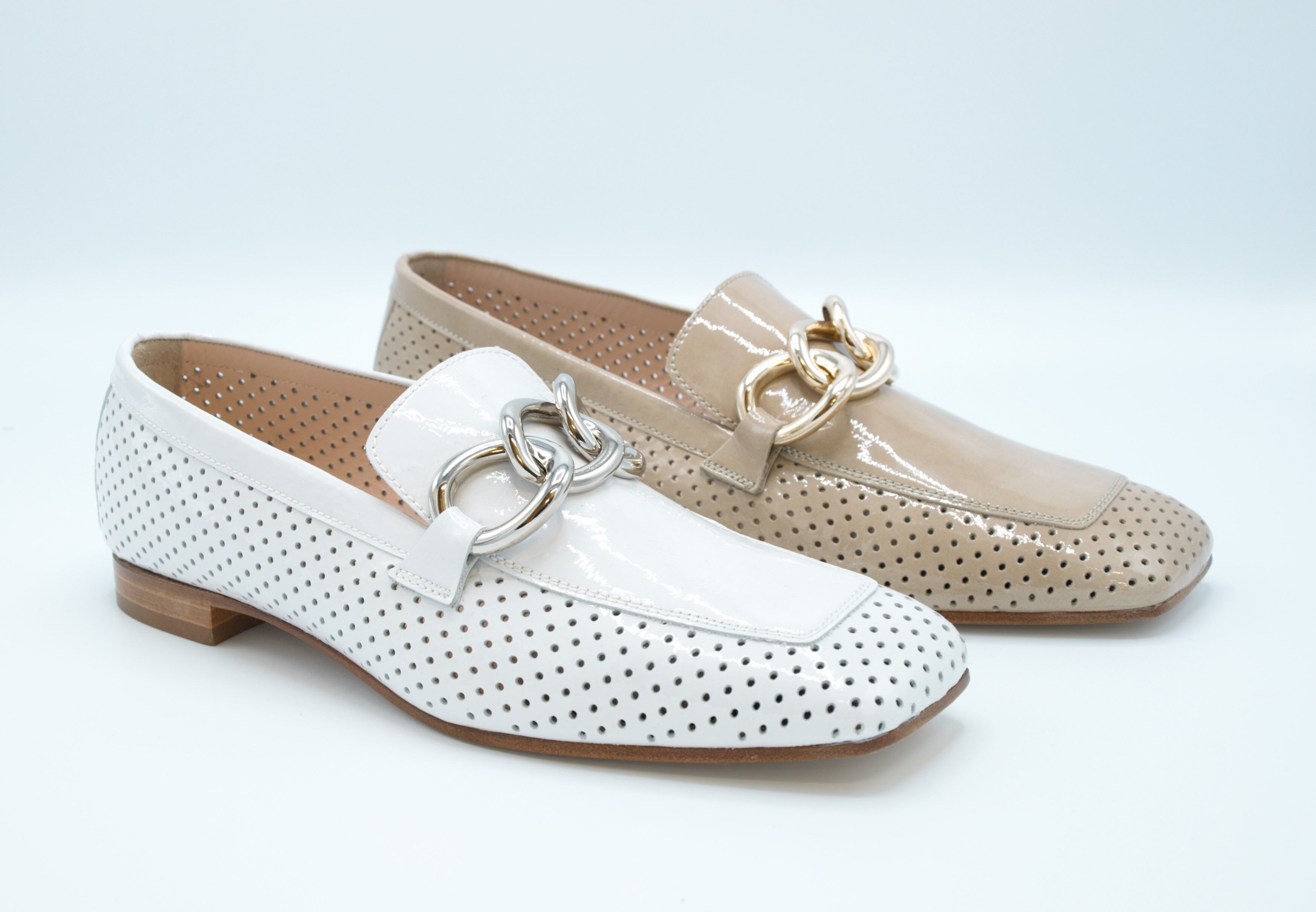 goudkeurige chain op de wreef geeft de schoen een eigentijdse klassieke look. Door de geperforeerde zijbladen is het een luchtige schoen voor in het voorjaar.Merk: PertiniType Schoen: LoaferKleur: BeigeMateriaal Buitenkant: LakMateriaal Binnenkant: LeerMateriaal Zool: RubberWijdtemaat: NormaalUitneembaar Voetbed: NeeHakhoogte: 2 cm