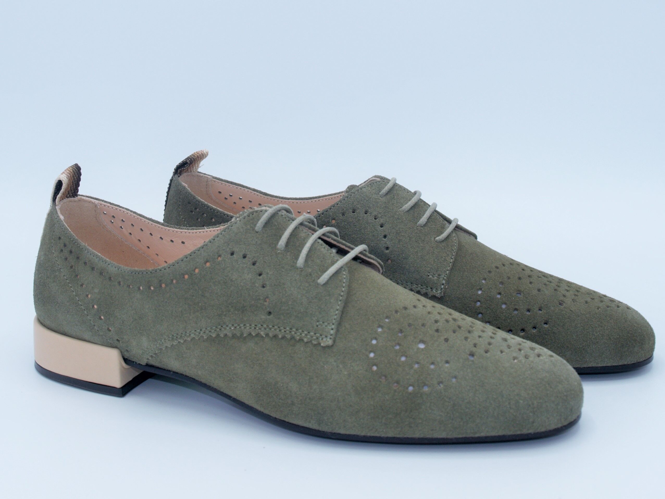 Nette veterschoen van Suede met ronde geperforeerde neus. Extra detail is de bekleede hak van lakleer in een contraseerde kleur en op hiel een stoffen lus in het kleurkarakter van de schoen.Merk: PertiniType Schoen: VeterschoenKleur: GoenMateriaal Buitenkant: SuedeMateriaal Binnenkant: LeerMateriaal Zool: RubberWijdtemaat: NormaalUitneembaar Voetbed: NeeHakhoogte: 2 cm